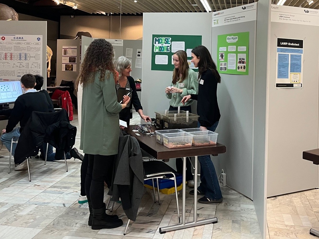Souverän haben sie ihre Projekte präsentiert und den ganzen Tag Rede und Antwort gestanden. Während eine Gruppe selbst konstruierte Modellmoore im kleinen Maßstab präsentierte, haben sich zwei andere mit dem Plastikfressverhalten von Würmen beschäftigt. Mit den Sonderpreisen des Senckenbergmuseums sind alle sehr zufrieden. Vor allem, da es sich bei uns um echte und alleine entwickelte und vorgestellte Schülerprojekte handelt.