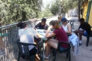 Es war schön warm, sprich: viel zu heiß, an die 40 Grad und es gab einen Pool, der für uns aber nicht in Frage kam, weil man da Badekappen tragen musste. Da es daneben aber auch Trampoline gab, war es in unserer Freizeit sehr lustig.