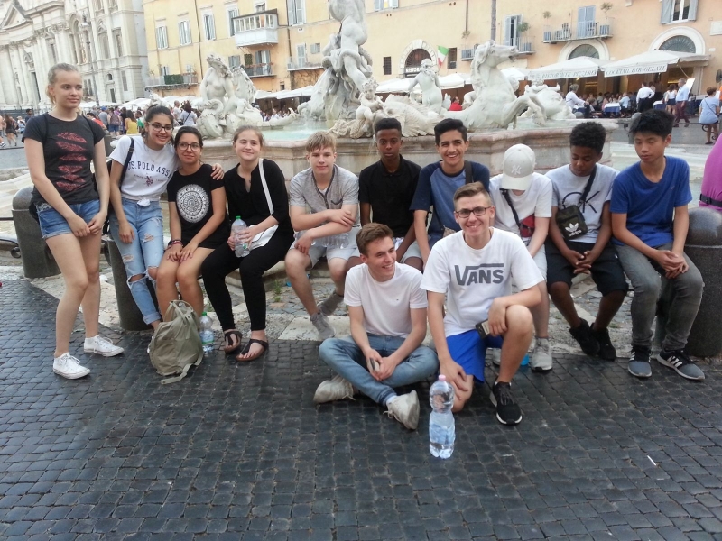 Danach, es war inzwischen schon ziemlich spät, ging es mit dem Bus wieder zurück zum Hotel, um gemeinsam Pizza zu essen. Am nächsten Morgen wanderten wir zum Kolosseum. Wir sind zwar nicht reingegangen, aber trotzdem wirkte das Amphitheater schon von außen sehr beeindruckend. Anschließend haben wir uns durch die vielen Touristen gedrängt, um zum Forum Romanum zu gelangen. Frau Liebenau hat uns einiges über das Forum erzählt, wie zum Beispiel über die Vestalinnen, die im alten Rom das Herdfeuer zu bewachen hatten, und die Bedeutung der einzelnen Gebäude. Dann saßen wir noch an der Stelle des alten Kapitols, wo die wichtigsten Götter der Antike, Jupiter, Juno und Athene, angebetet wurden. Zum Schluss haben wir uns entschieden zum Trevi- Brunnen zu laufen, um eine Münze hineinzuwerfen und damit sicher zu gehen, dass wir wieder nach Rom kommen.