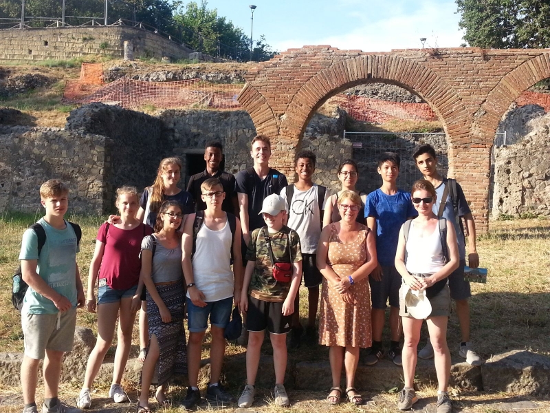 Außerdem blickt man auch direkt zum Vesuv, von dem alle sprechen und der mit seinen Lavamassen so viele Tausend getötet hatte. Man sieht dort auch, wie Archäologen noch weiter Dinge ausgraben, die noch immer verschüttet da liegen. Das zeigt, wie langsam, vorsichtig und geduldig man dort arbeiten muss. Insgesamt hat es mich gefreut, dass wir in Pompeji waren und ich mir jetzt alles so viel bildlicher vorstellen kann, wenn wir im Lateinunterricht drüber sprechen. (Andu Kelati, 8e)