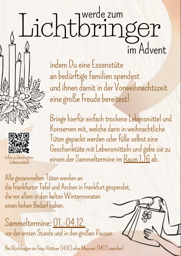 In diesem Jahr findet an unserer Schule vom 01.-04. Dezember wieder eine Spendenaktion zur Adventszeit statt. Unter dem Motto „Lichtbringer werden“ möchten wir Lebensmittel für bedürftige Familien sammeln und diese an die Frankfurter Tafel und an die Arche spenden.