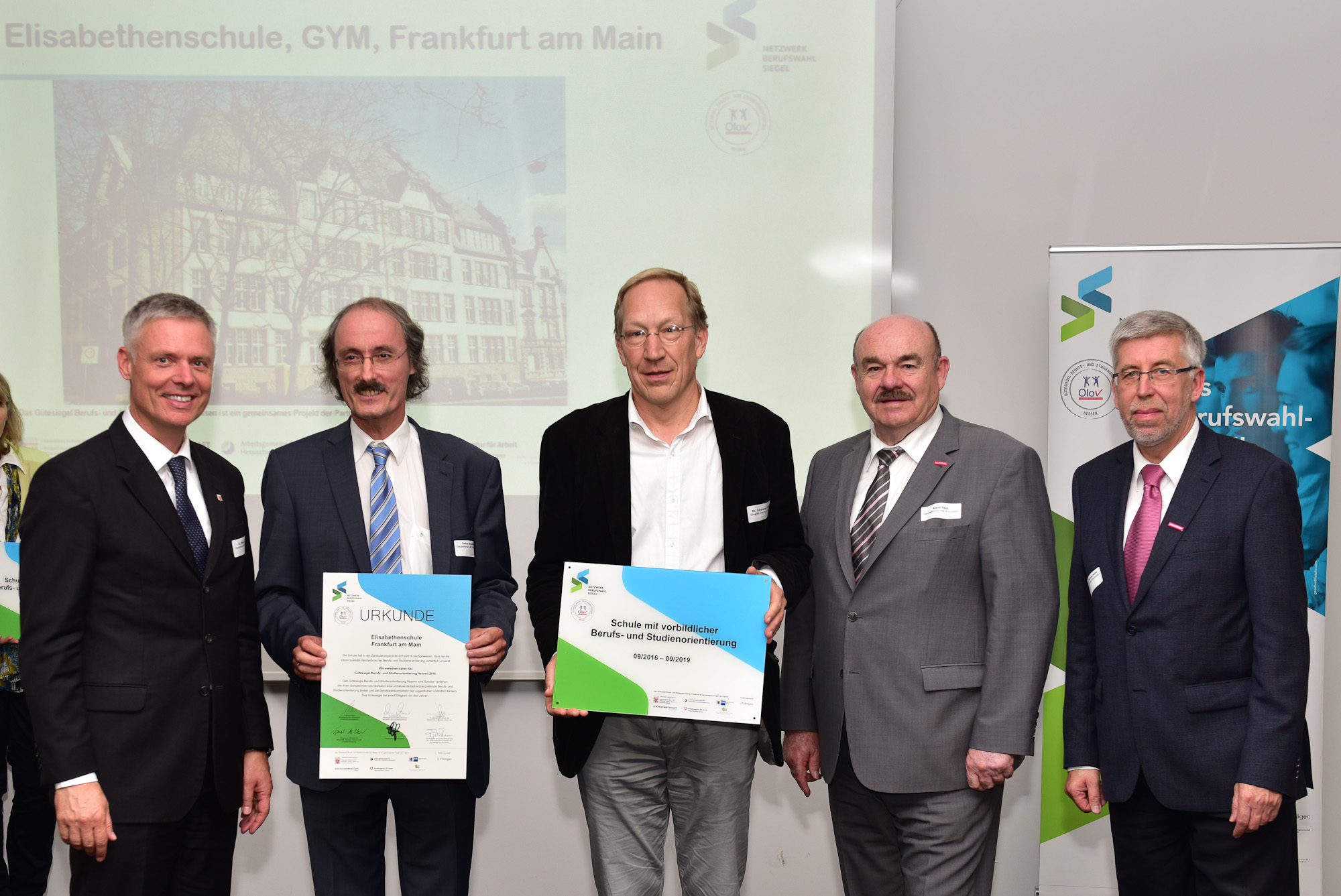 Für ihre erfolgreichen Konzepte im Übergang von der Schule zum Beruf haben Dr. Manuel Lösel, Staatssekretär im Kultusministerium, Klaus Repp, der Vizepräsident der Arbeitsgemeinschaft der Hessischen Handwerkskammern und Sara Günnewig, Head of Marketing & Communications der J.P. Morgan AG, die Elisabethenschule und 27 weitere Schulen mit dem „Gütesiegel Berufs- und Studienorientierung Hessen“ ausgezeichnet. Die Veranstaltung fand in feierlichen Rahmen am Donnerstag, 22.09.2016 im Meistersaal der Handwerkskammer in Wiesbaden statt. Herr Dr. Twardella und Herr Neureiter nahmen die Urkunde und die Plakette entgegen.