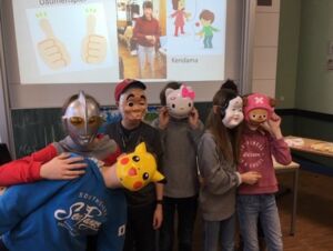 Während des zweiten Teils des Besuchs durfte die Klasse in kleinen Gruppen, angeleitet durch die vier Mitarbeiter des Konsulats, Spiele ausprobieren: darunter waren Fingerspiele, Origami, Geschicklichkeitsspiele und vieles mehr. Mit viel Freude und Geduld erklärten die freundlichen Mitarbeiter die Spiele und animierten zum Mitmachen. Insgesamt war der Besuch ein voller Erfolg und wir bedanken uns ganz herzlich bei den Gästen.