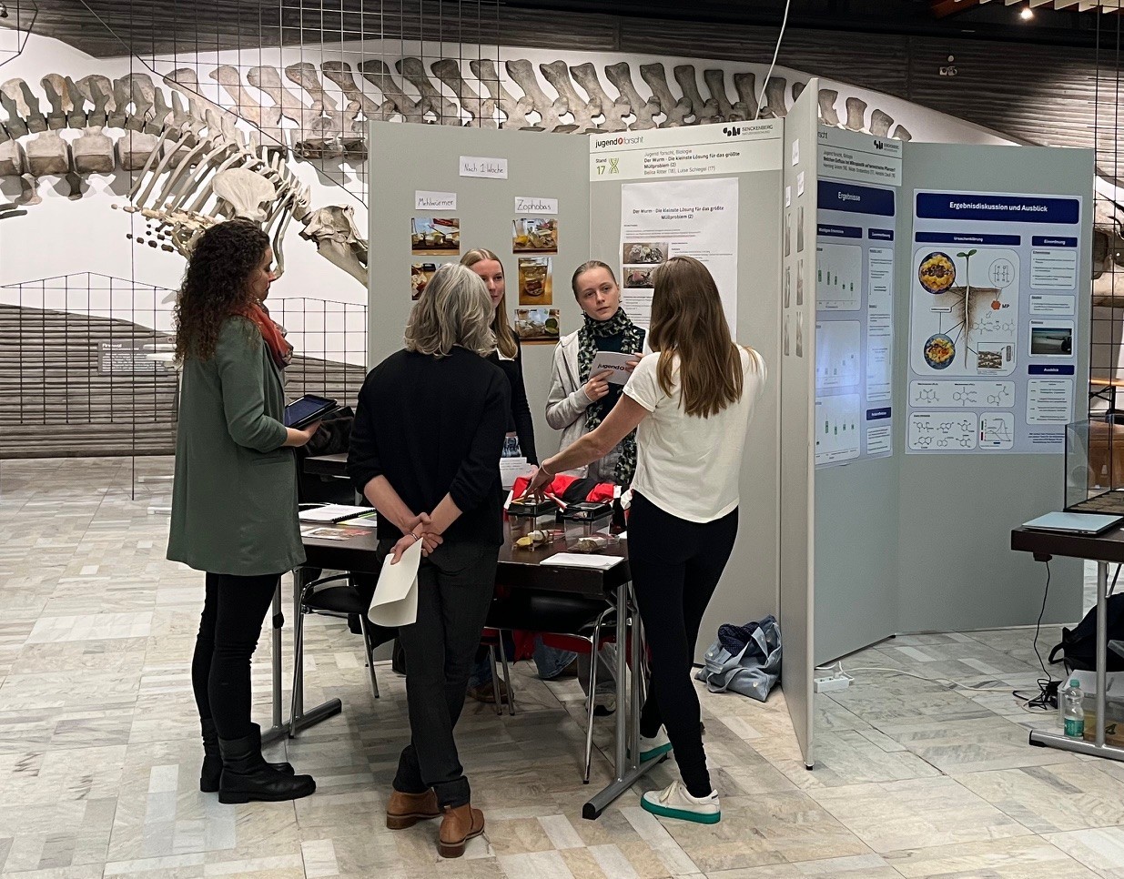 Souverän haben sie ihre Projekte präsentiert und den ganzen Tag Rede und Antwort gestanden. Während eine Gruppe selbst konstruierte Modellmoore im kleinen Maßstab präsentierte, haben sich zwei andere mit dem Plastikfressverhalten von Würmen beschäftigt. Mit den Sonderpreisen des Senckenbergmuseums sind alle sehr zufrieden. Vor allem, da es sich bei uns um echte und alleine entwickelte und vorgestellte Schülerprojekte handelt.