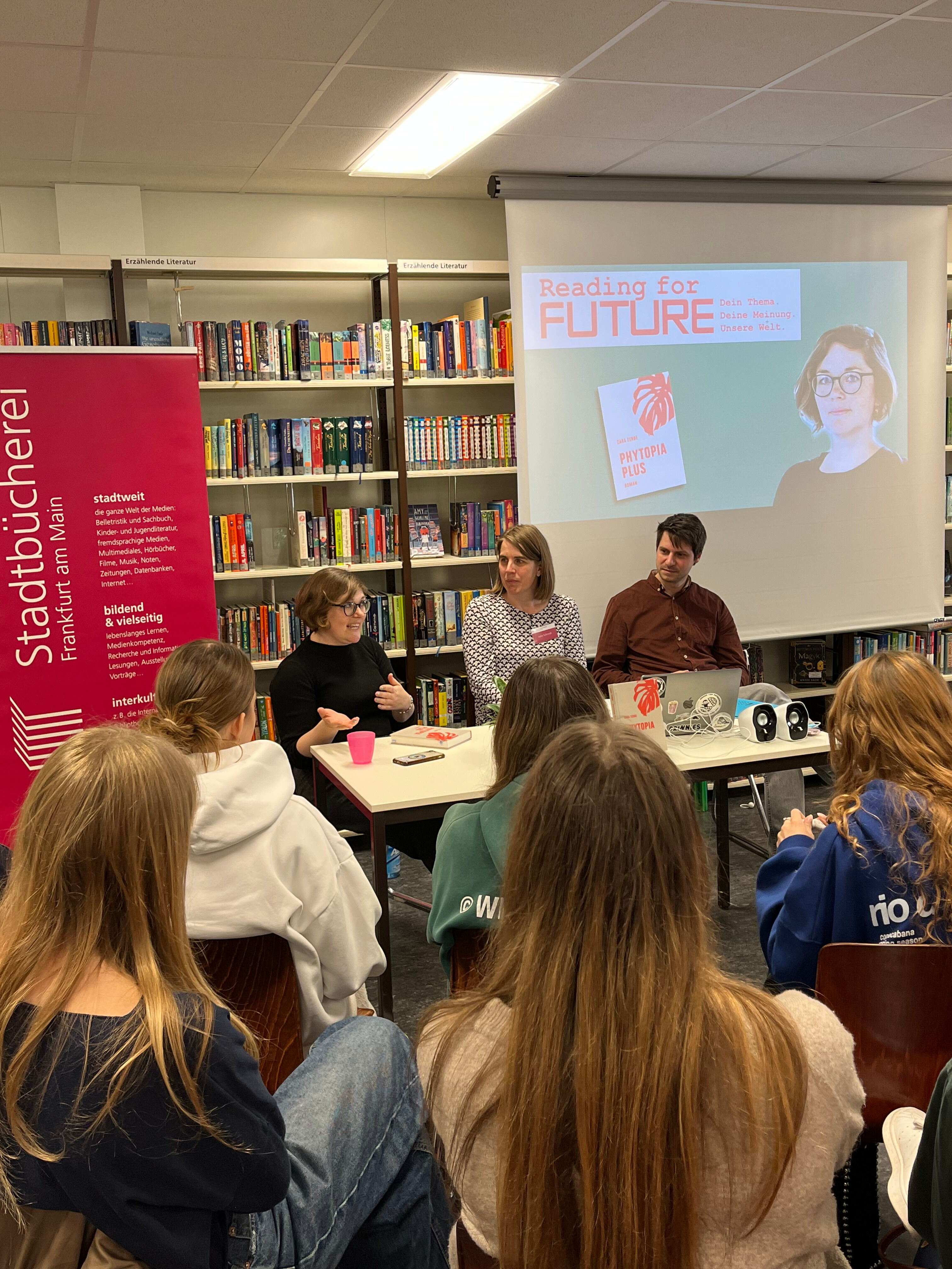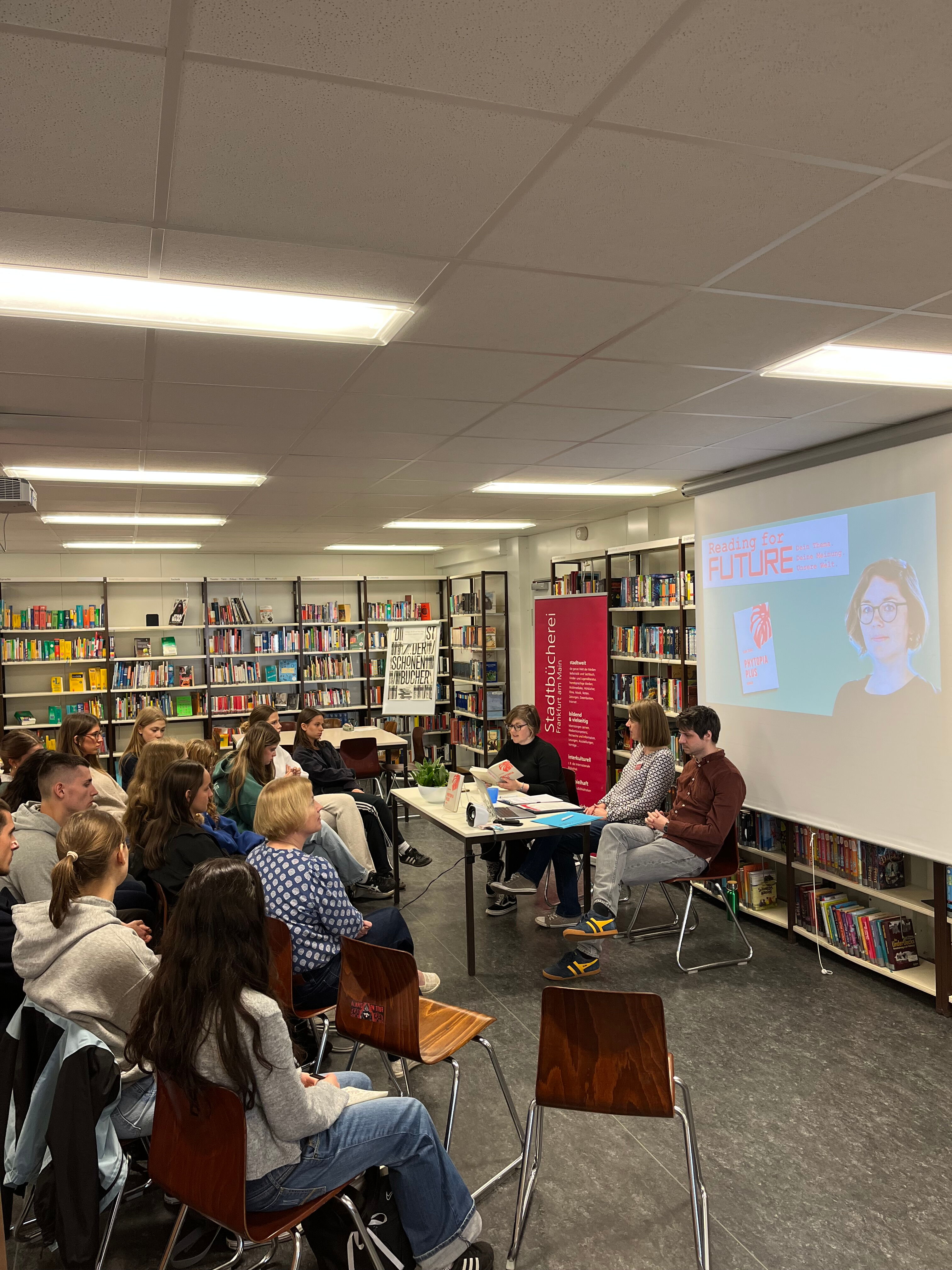 Die vierstündige Veranstaltung bestand aus einer Lesung ihres klimadystopischen Romans „Phytopia Plus“ und einem Schreib- bzw. Klimaworkshop in Kooperation mit dem Klimareferat Frankfurt und dem Verein „Umweltlernen in Frankfurt am Main“. Teilgenommen hat der Deutsch-LK aus der Q2 von Frau N. Albrecht.