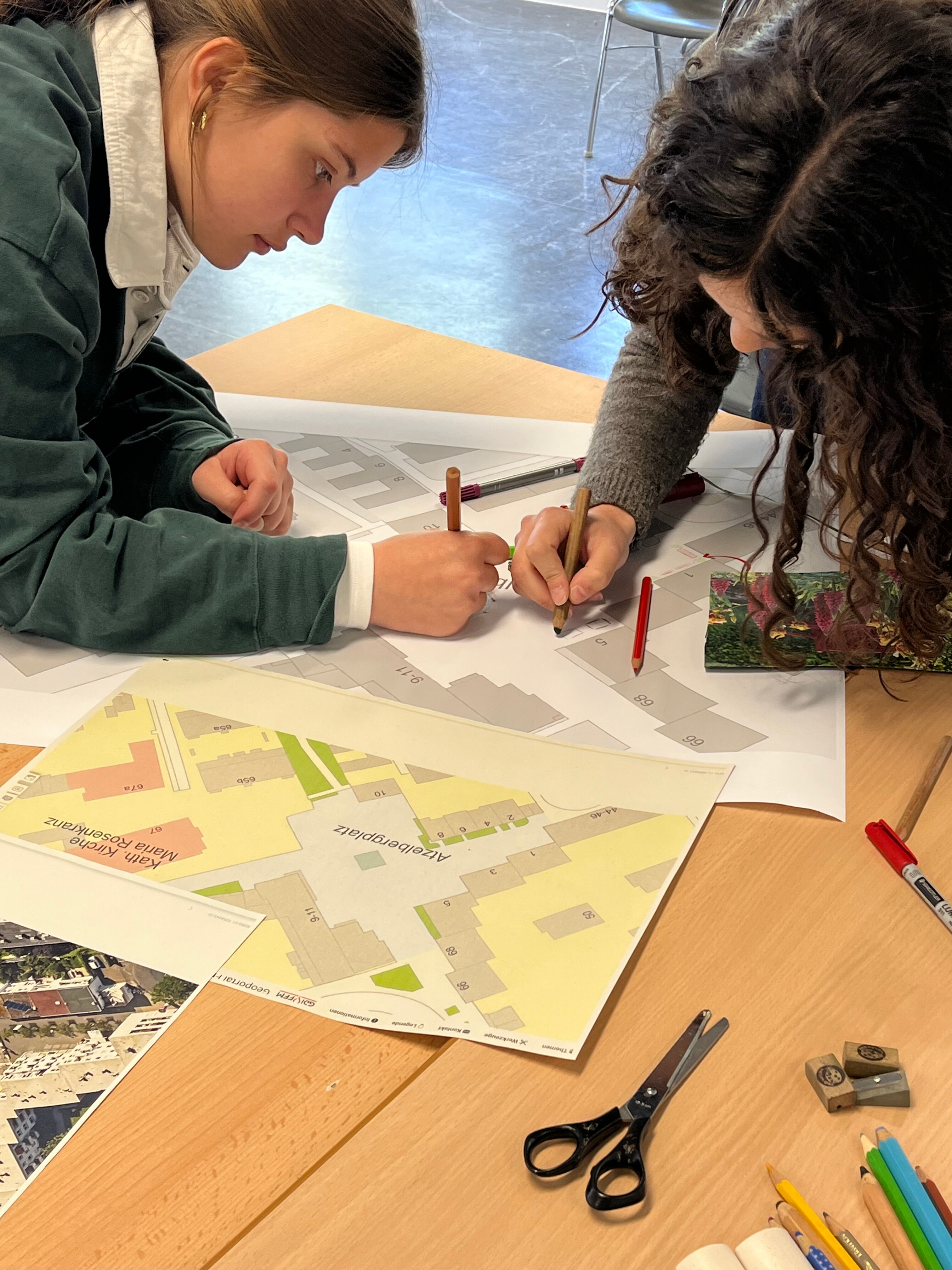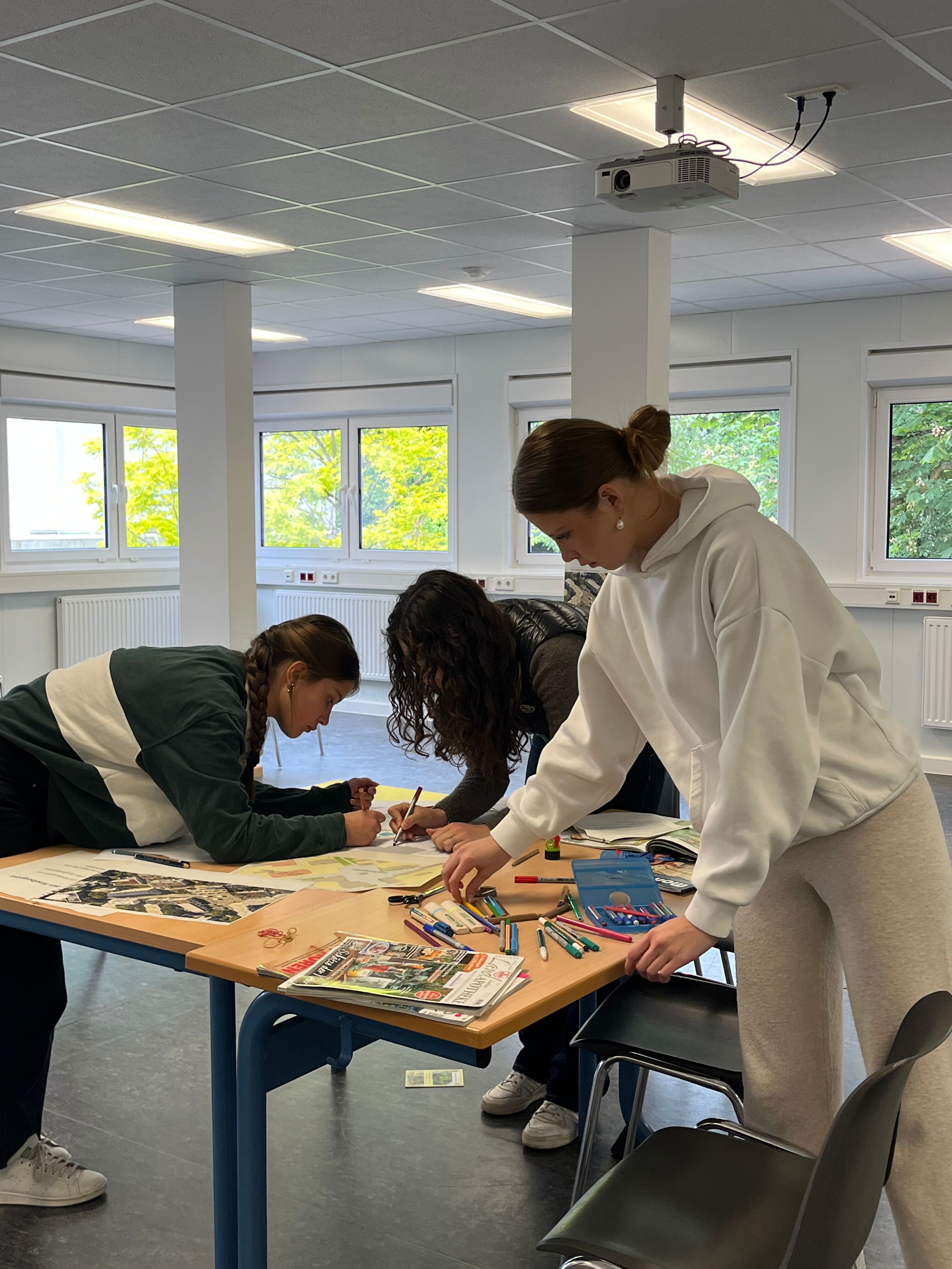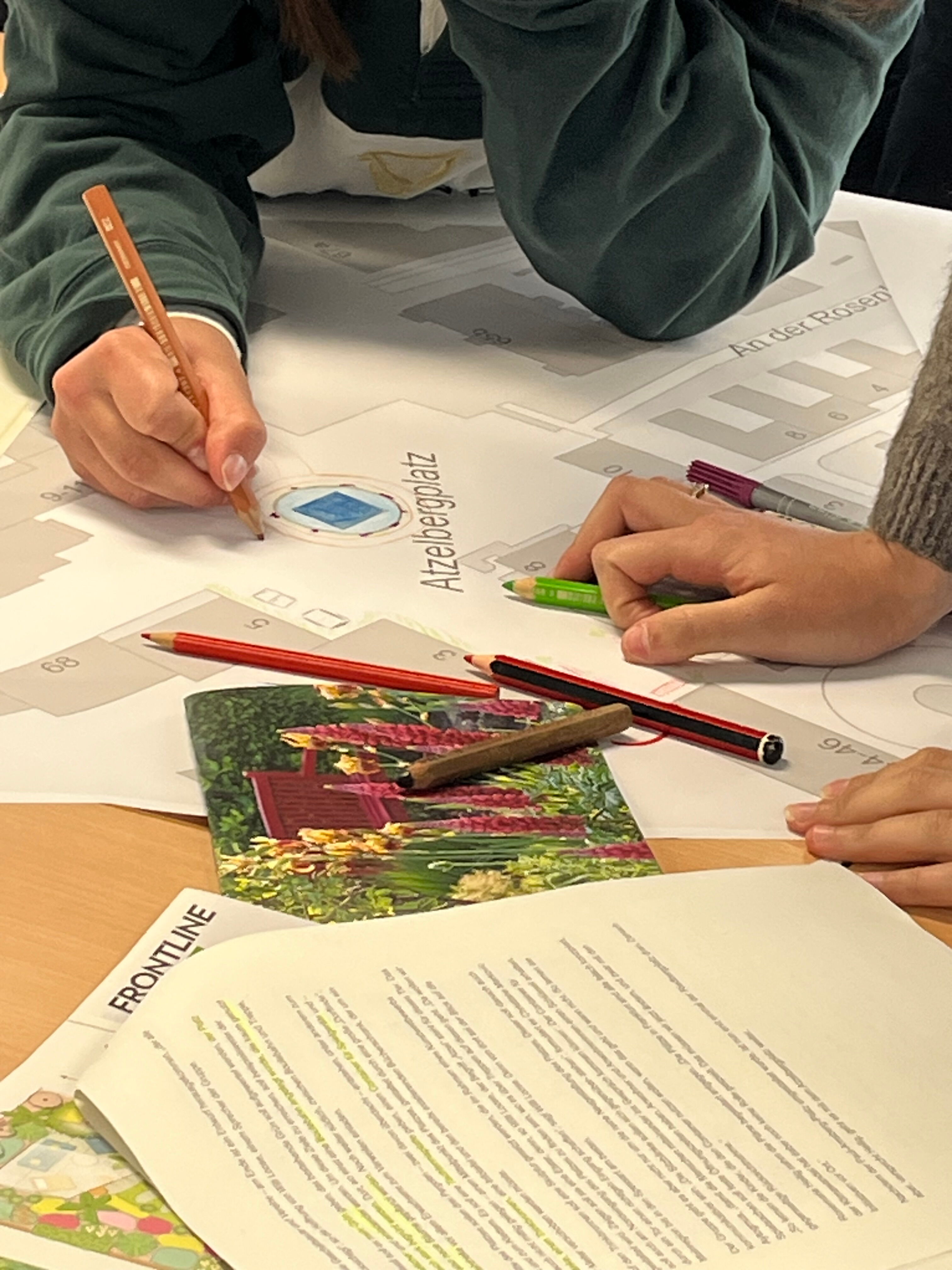 Nach der Lesung gab es einen Einstieg ins Thema Klimakrise und deren Folgen für die Stadtplanung durch Herrn Felber vom Klimareferat. Bekannte Beispiele aus Frankfurt sorgten für regen Austausch mit der Gruppe. Anschließend nahm eine Hälfte des Kurses am Schreibworkshop mit Zara Zerbe teil und schrieb Texte, die in einer fiktiven Zukunft spielen, während die andere Hälfte gemeinsam mit Herrn Felber klimafreundlichere Visionen der Stadtgestaltung anhand von Beispielorten in Frankfurt entwarf.