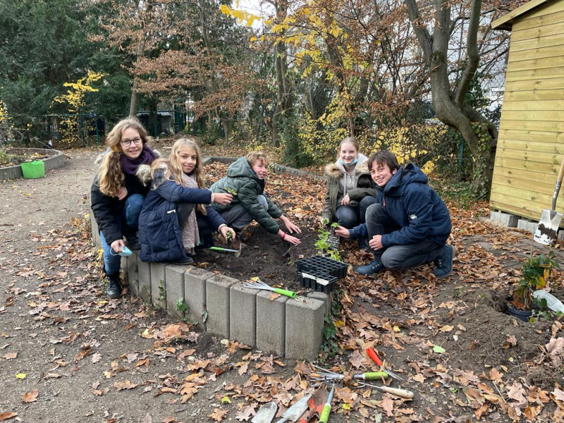 Der Schulgarten der Elisabethenschule ist ein kleines grünes Paradies inmitten der Großstadt. Dass dem so ist, dafür sorgt die Gartengruppe der 7d mit ihrer Klassenlehrkraft, Frau Dworak. Einige Schülerinnen und Schüler sind schon seit der fünften Klasse mit dabei. Seit der Corona-Pandemie kommen auch andere Schülerinnen und Schüler dazu und helfen mit.
